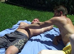 His thought finally led to action when he leaned over and began rubbing Marcus's chest.And that led to Marcus getting up and the two going at it. First they suck each other and then Taylor Aims gets his wish; Marcus's cock pounding his ass.