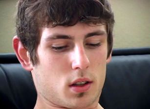 He gives us quite a show. Choking his rock hard love-wand with his hand, he's engulfed in the skin flick. You know he's envisioning himself in the porn, bending someone over and pounding them relentlessly from behind. When he can't hold out anymore, Trevor tilts forward, letting his cock release its pent up load, shooting two globs onto the carpet while a river of pearly-white protein drools from his cock head onto his hands and the couch; quite a show.