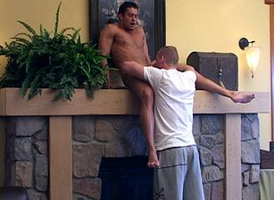 Patrick sucks his buddy on the fireplace mantel before taking him by the cock to a chair in the living room. When he's ready to make Cody cum, he lets the stud fuck his face before stroking him off, making sure to tease his ultra-sensitive post-orgasm dick.