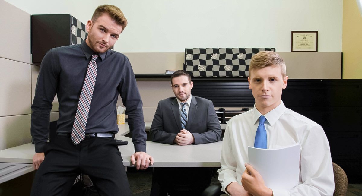 As the build up to election draws near, it's serious business in Dylan Knights campaign office. Stumping hard for their man, Dylan's office of interns have been working around the clock and at least one of them, young Alex Tanner, appears to be feeling the effects of the non-stop bustle. Fellow intern Brett Beckham has noticed Alex getting a bit flustered all day, and he's also noticed that Alex is packing a sweet little ass beneath his khaki dress slacks. When Alex steals away to make copies of the speech he's edited, Brett takes it upon himself to do a little informal polling, telling Alex he needs to relax and already easing his hand up Alex's tie as he slips his other hand on Alex's ass. Alex tells him they should set up a night, but Brett is way ahead of him and is already unbuttoning his shirt, pushing Alex down to his knees as he starts to unzip his fly. Alex takes Brett's cock in his mouth and begins to suck him off, downing his cock and feeling him deep in his throat. Brett puts his hand on Alex's head and pushes him further down his shaft, before pushing the new intern up against the desk and eating his ass out, fantasizing about what he's going to do to it. Alex closes his eyes and can see stars as Brett strokes his cock, spitting on his hole as he stands up to enter from behind. Brett moves Alex over to a small ottoman and grabs him by the tie, plunging his cock deep into Alex as he bends on all fours. Brett pounds Alex from behind as Alex takes every inch, before they switch and it's Brett lying on the ottoman as Alex rides him, his hard dick slapping against his stomach with every push. Brett flips him onto his back as Alex strokes himself off, cumming all over his stomach as Brett pulls out and wets him with even more jizz, leaving Alex cum-covered but much more relaxed than he was when he entered the closet.