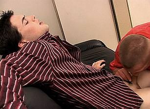 Nathan returns the favor, pushing Tim onto the bed where they move into a 69. From there, the two get ready to relieve themselves. Tim douses Nathan in a load of cum.