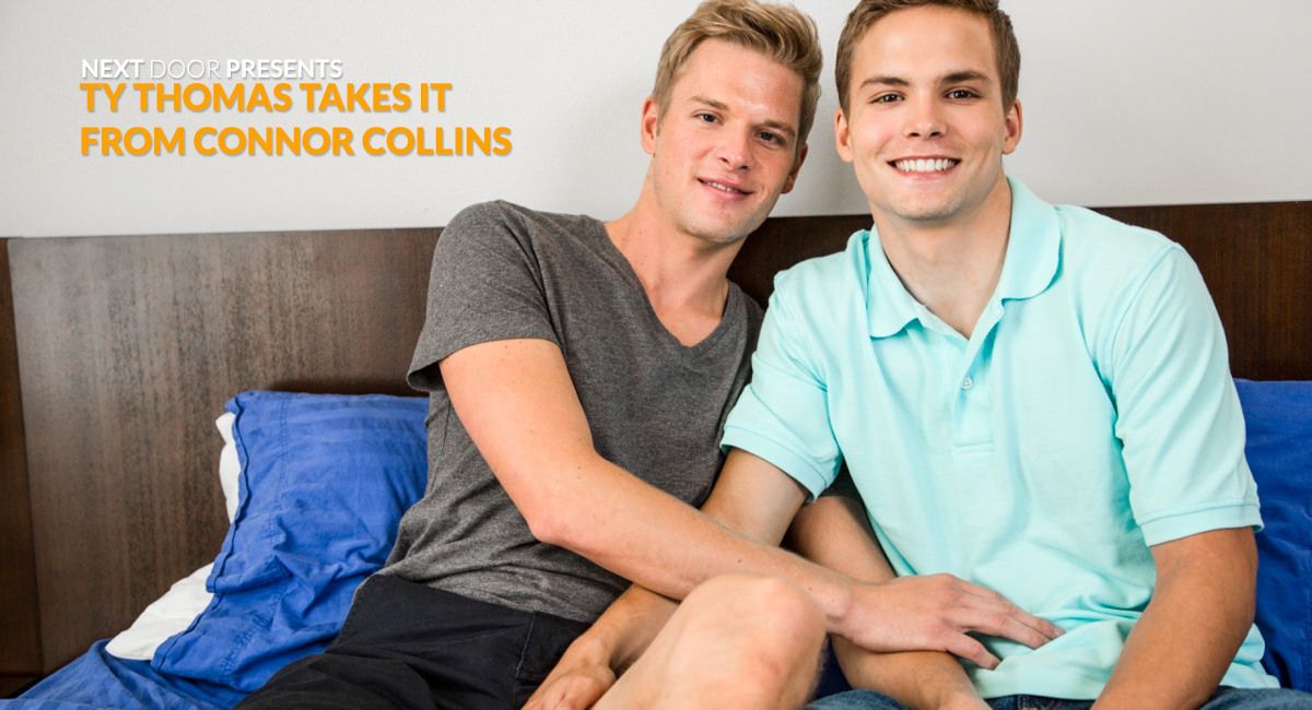 Mr. Next Door nominee Ty Thomas eagerly awaits the go ahead to begin messing around with Connor Collins. Connor is the newest piece of fresh meat, and Ty has been fantasizing about him since seeing him the night before at the airport. Connor's slim build and open mind suggest that the two of them will hit it off great, and when Connor confesses to loving to give head, Ty's cock perks up and pays attention. Sure enough, as soon as the clothes come off, Connor delivers on his promise, downing Ty's cock before feeding him his own. Connor made sure to pack a nice cock, and now Ty is having his way with it, riding it as he runs his hands up and down Connor's smooth skin. Connor proves he's just as comfortable taking the dick as he is giving it, and Ty pounds him from behind before switching up and letting Connor have his way with him. Ty is on his back as Connor fucks him missionary, long dicking Ty and fucking the cum out of him as he pulls out and blasts Ty with his first on-screen cumshot, a massive load that Connor has been storing for over a week. Laying there covered in all Connor's cum, Ty definitely gives him his seal of approval and a vote of confidence to come back for more. Enjoy!