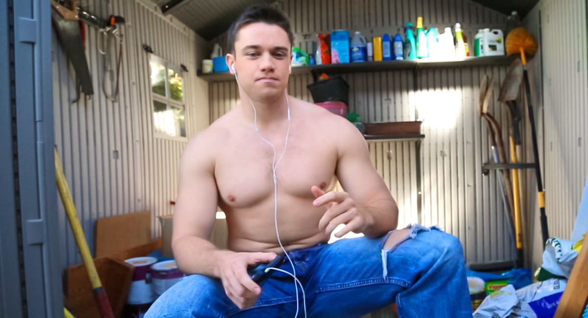 Once naked, Derek fondles himself, flicking his dick back against his stomach as he spreads his legs and leans back. Then, he balances on two buckets, pushing his cock back through his legs and fingering his asshole, before firing his load off and shooting the ground beneath him with a spunk infused blast.
