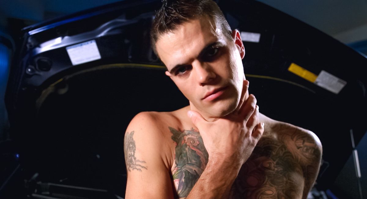Jake Glazer is a free-wheeling loose cannon who enjoys living it up, playing hard and having as much fun as possible along the way. An extreme sports enthusiast, Jake lives for the snow and the sea, but when he's not catching air on some kind of board, he's hitting the clubs for a night on the town, in hopes of finding some form of debauchery to engage in. Jake likes it rough, tough and little bit nasty, though, so modest prudes need not bother. Here we see Jake in the garage, tuning up the ride and then doing a little maintenance under his own hood, if you know what I'm talking about. Unzipping his cover-alls, he peels out of his clothes and leans back against the side of the car, fondling his cock while working a vice-grip on his nipples. Cock growing, he reclines on the floor and begins to fondle his asshole as his cock swells to maximum capacity. Running his hands down his chest, he explodes a bucketful of cum all over himself, covering himself in his own jizz as he lay exhausted and spent on the garage floor.