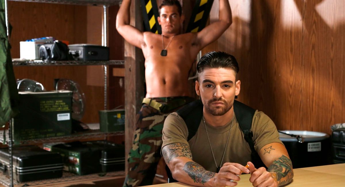 As Luke Milan stands bound and blindfolded at interrogator Johnny Torque's request, it occurs to him that he may be fucked, figuratively speaking. After all, desertion is not a crime the military takes lightly, and Johnny seems to have a particular hard about getting Luke to confess his treacherous behavior. But when Johnny rips Luke's shirt off of him and gives his tanned chest a smack and a pinch, it finally dawns on Luke that he might be fucked literally, as well, which is definitely something Luke has some experience with. Johnny slaps at Luke's cock, gripping it and man-handling it before falling to his knees and downing Luke's huge dick. Johnny's nearly choking himself as Luke's cock swells to maximum density, before throwing his prisoner onto the ground and having him return the favor. Luke sucks Johnny's dick like his freedom depended on it, but Johnny isn't letting Luke get off so easily, so he bends him over the interrogation table and proceeds to pound him from behind, smacking Luke's ass as he fucks a form of punishment out of Luke. Luke mounts Johnny's dick, bouncing up and down as Johnny sits in a chair, before Johnny throws him onto the table for one final push, fucking the cum out of Luke as he lay on his back, and then absolutley blasting Luke in the face with a thick load of soldier jizz. Luke assumes he's free to go, but now that Johnny knows he's got a willing fuck slut, he orders the guards to take Luke back to his cell for future 'interrogation'.