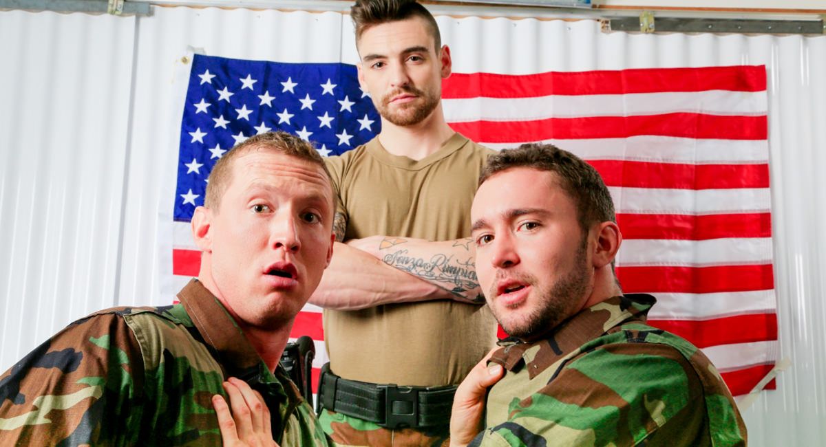 When the time is right, Johnny pops out from behind his curtain, startling Colt and Pierce. They stand at attention for a moment before Johnny tells them to continue as they were. He positions himself to dip his firm cock into Colt's mouth while Pierce licks Colt's tight butthole. After some of this, Seargent Torque orders Pierce to fuck Colt's ass. They follow orders right away, and Pierce slides his massive dick into Colt's warm hole. Colt takes the solid walloping and takes Johnny's boner into his mouth at the same time.