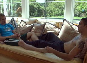 Mason pushes him down on the couch and quickly starts to remove D.J.'s attire. Next you know it Mason is choking on his buddies cock and drooling all over the place. Hard and ready to fuck Masons tasty smooth hole D.J. plows right in.